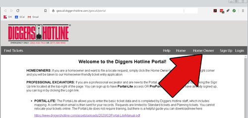 Please read all of the following information, and when prompted, click on the Home Owner link to start your locate request, as shown in the image.